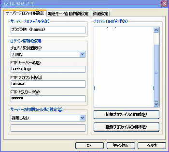 ●60才からのHP作り(準備編)60才から「ホームページ作り」を始めましよう。ホームページは年齢に関係有りません ので、安心して60年の人生経験を生かして、楽しいホームページの公開です。肩の力を ぬき準備に入ります。 1.ホームページの作成ソフトを、インストールして(一般的なIBMホームビルダー) パソコンの環境設定を見直す。特にファイルに拡張子の表示は大切ですが、win98 ・Me・2000・Xpとでは設定仕方が異 なりますので調べて設定してください 尚、MS-DOSの基礎も復習してください 2.作成したホームページを預けて公開する場所を確保する。加入しているプロバイダー に申込んで、アドレスを交付してもらいます。プロバイダーのホームページを開き、 → 個人向けサービス → オプションサービス→Page ON (OCN)→ お申し込み→プロバイダー加入時のIDとパスワードを入力し、自分の希望するURLと パスワードを入れると「ホームページURL」と「FTPサバー名」・FTPアカウン ト」・「パスワード」が交付される。(Yahoo!ジオシティーズに申し込む方は (こちらです) ※運用開始日時が Mail と文書で通知されます。開始まで二日位掛かり ますので、早めに申し込んで準備してください。申し込み方法は各社大体同じですの で、参考にしてください。 3.転送ソフト(IBMホームビルダーに付いている) 4.ホームページで公開する内容を決め材料を準備する。 (原稿や写真その他) ◆上記の準備が出来ましたら作業に入りましよう。 ①「index.html」ページの作成 ほとんどのホームページは、複数のホームページを、1つのまとまりとして公開してい ます。このまとまりのことを「サイト」と呼びます。一般に、「ホームページ」は、 WWWプラザで表示する画面そのものを指す言 葉として使われていますが、「サイト の入口」というような限定的な意味もあります。ここではTOPページと呼び index.htmlです現在確保されたHP(Web)にはindex.htmlが用意されていますので 別に自身のPCに作成します。ホームビルダー起動→ファイル(F)標準モードで新規 作成(B)→タイトル文字入力→文字の大きさ・色・書体を決め→Enterキー→下段に 挨拶文を書きます。行の最後は「shift+Enter」で改行し挨拶文を書き込んで完了→ 編集(E)→ページの属性(I)→ページ情報→背景/文字色→OK→ファイル(F) →名前を付けて保存「名前」は「index.html」で保存する。以上で「TOPページ」 は完成です。 ※通常ホームページでは最初に開くページは「index.html」です。 作成中は「プレビュー」で確認しながら 編集してください。 保存するフォルダーは新しく作り名前を付けて保存します。初回のページは文字の みと し次回 から画像(写真)を挿入した、ページを作りましよう。 (ホームビルダーをツール→オプション-ファイルで「htmll」 に設定を変更してください) ★サンプルページ(test_index.html) ②「index.html」ページの転送<BR> 1.プロバイダー交付のMailか文書を手元に用意し 2.ツール(T)→FTPツールの起動→新規プロファイル作成 ●→サーバープロファイル名=ホームページのタイトル名 〈ログイン情報設定〉 ●プロバイダーの選択=ホームページを借りてるプロバイダー ●FTPサーバー名 =FTP用に交付されたURL ●FTPアカウント =FTP用に交付されたアカウント ●FTPパスワード =******* 〈サーバーの初期フォルダーの設定〉 ●指定が有るときのみ入力する無いときは「指定しない」 ●確認してOK→次は「接続」です ![]() ![]() |