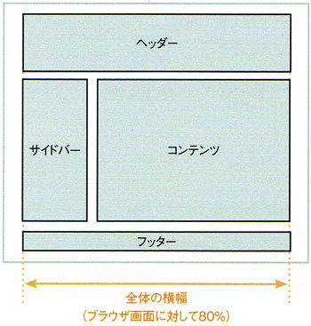 全体の横幅は、プラウザ画面の横幅に対して80%に設定します。これで、画面の横幅に合わせて、2段組の横幅を変えることが出来ます。