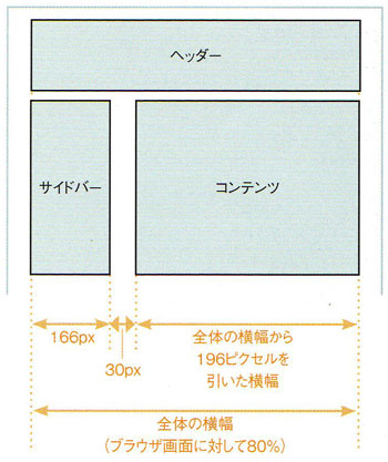これに対して、コンテンツ部分の横幅は、全体の横幅からサイドバーと余白部分の合計196ピクセルを引いた長さで表示するように設定します。