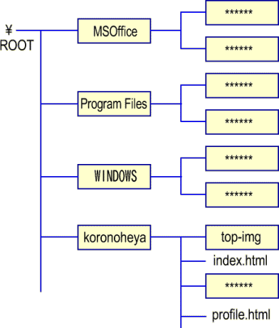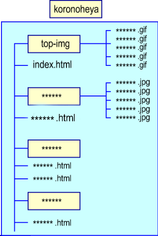 | Windowsでは「C:\koronoheya\index.html」と表記し「C」ドライブの中の「koronoheya」のフォルダの「index.html」と言う意味です。インターネットでは「UNIX」のOSで動かしていますので、ドライブの観念が無く「/」(ルート)のkoronoheya「デレクトリ」(フォルダ)「ファイル」と置き換えてください。FTP転送ソフトで接続すると分かります「/」の表示がでるはずです。ほんの一部ですが参考にしてください。 /koronoheya/index.html |